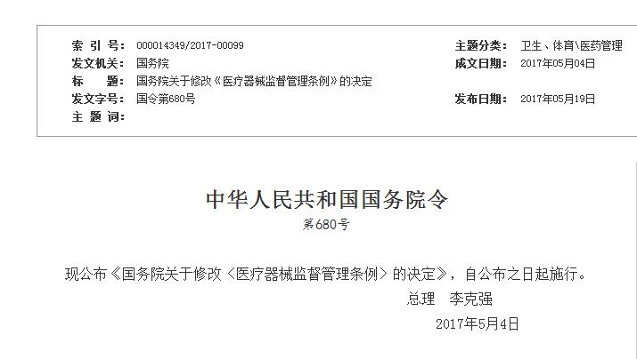 5月4日,國務(wù)院總理李克強(qiáng)簽署了國務(wù)院令第680號,公布了《國務(wù)院關(guān)于修改〈醫(yī)療器械監(jiān)督管理?xiàng)l例〉的決定》,自公布之日起施行。