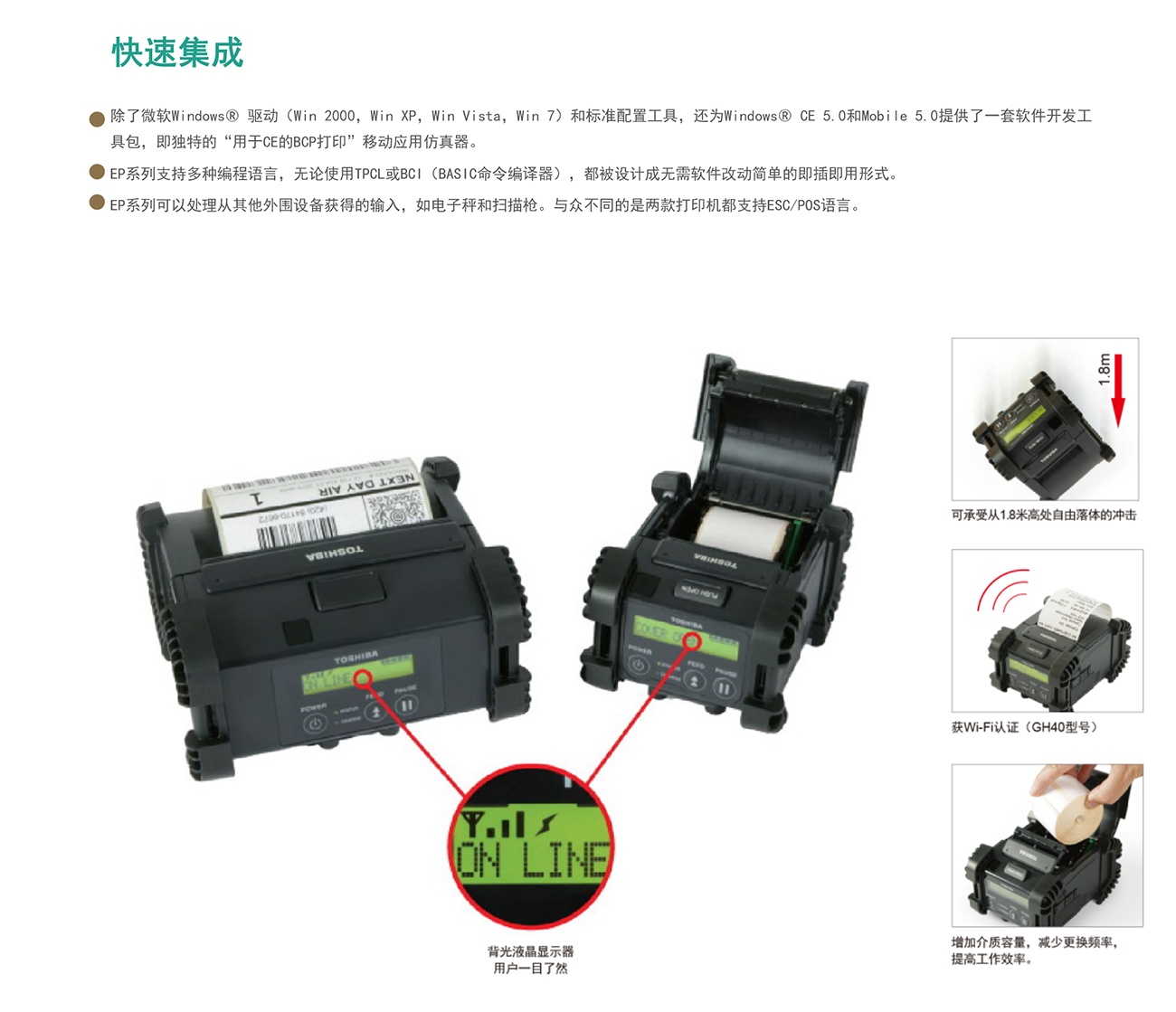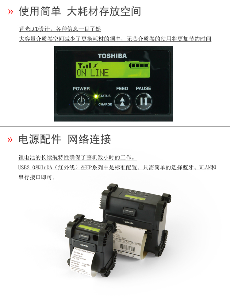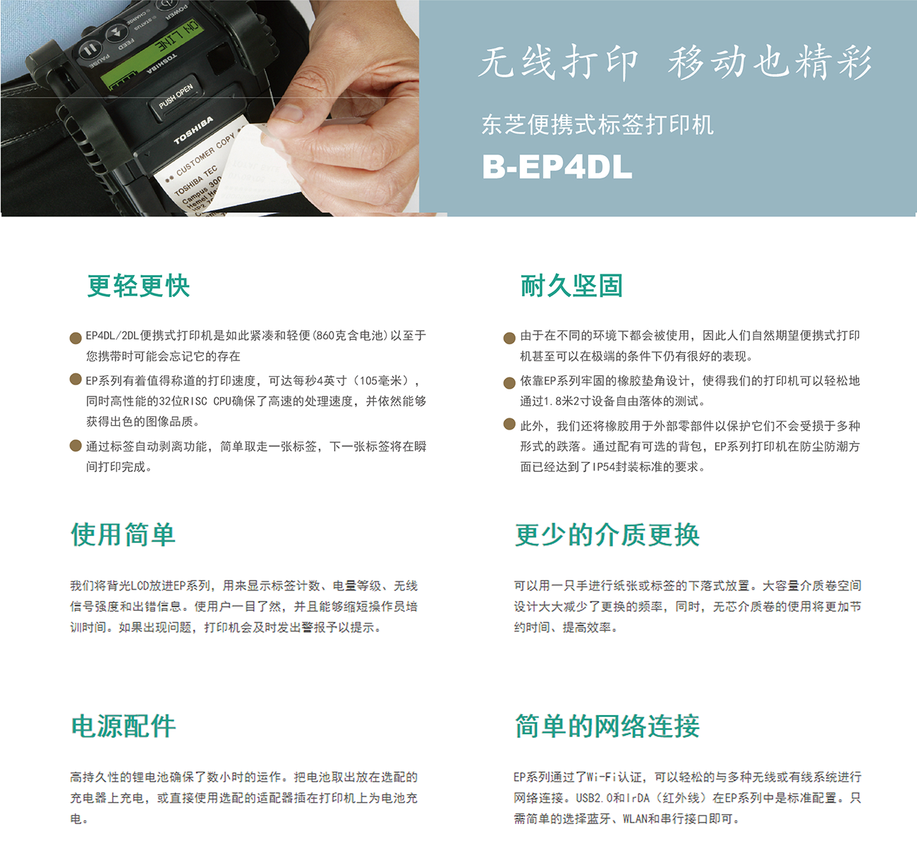 無(wú)論您身在何方,我們熱敏打印創(chuàng)新技術(shù)就在您的掌中。簡(jiǎn)潔時(shí)尚,2英寸和4英寸兩款便攜式熱敏打印機(jī)的酷黑EP系列,蘊(yùn)含著東芝對(duì)無(wú)線(xiàn)、移動(dòng)、可靠打印方案的承諾。廣泛的應(yīng)用領(lǐng)域:制造業(yè) / 物流業(yè) / 娛樂(lè)業(yè) / 紡織業(yè) / 政府、公共事業(yè) / 醫(yī)療衛(wèi)生業(yè) 聯(lián)系人:李先生 手機(jī):18929304946 陳小姐(業(yè)務(wù)):18929304947