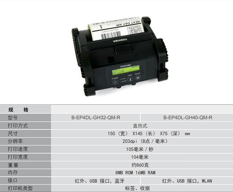 B-EP4DL便攜式標(biāo)簽打印機(jī)東芝EP4DL-GH32/GH40快遞物流零售便攜藍(lán)牙WIFI打印機(jī)