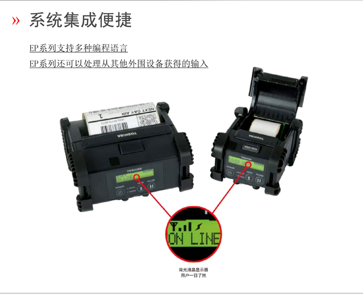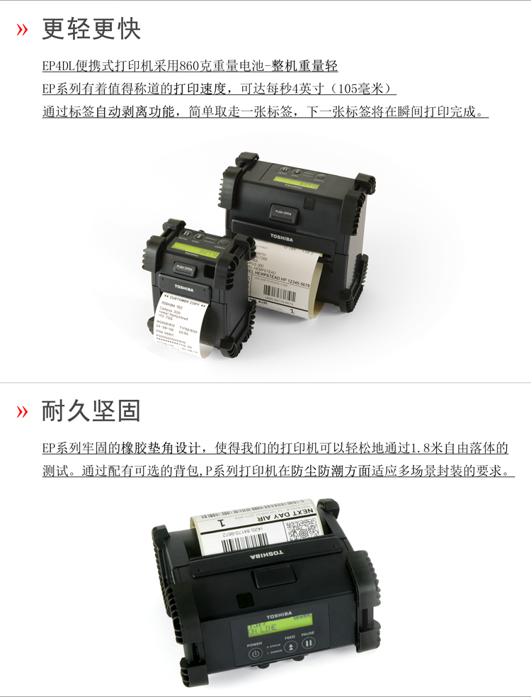 無(wú)論您身在何方,我們熱敏打印創(chuàng)新技術(shù)就在您的掌中。簡(jiǎn)潔時(shí)尚,2英寸和4英寸兩款便攜式熱敏打印機(jī)的酷黑EP系列,蘊(yùn)含著東芝對(duì)無(wú)線(xiàn)、移動(dòng)、可靠打印方案的承諾。廣泛的應(yīng)用領(lǐng)域:制造業(yè) / 物流業(yè) / 娛樂(lè)業(yè) / 紡織業(yè) / 政府、公共事業(yè) / 醫(yī)療衛(wèi)生業(yè) 聯(lián)系人:李先生 手機(jī):18929304946 陳小姐(業(yè)務(wù)):18929304947