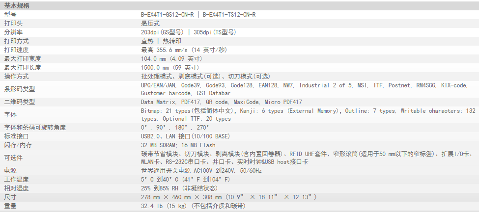 | 分辨率 | 203dpi(GS型號) | 305dpi(TS型號) |